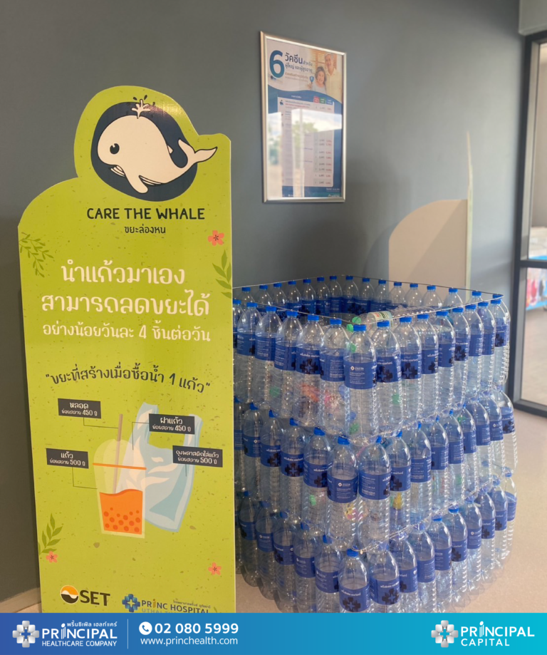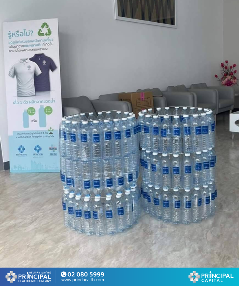 Hospitals under Principal Healthcare Group and Principal Capital Public Company Limited (PRINC) have introduced specially designated bins for plastic water bottles, crafted from used plastic bottles collected within the hospitals. These bins were created by the hospitals’ maintenance teams to serve as dedicated collection points for recyclable plastic bottles. Alongside the bins, informative and motivational signage has been installed to encourage staff and visitors to bring their own reusable water bottles in order to reduce single-use plastic waste. Educational posters also help raise awareness on the importance of waste separation and reduction.