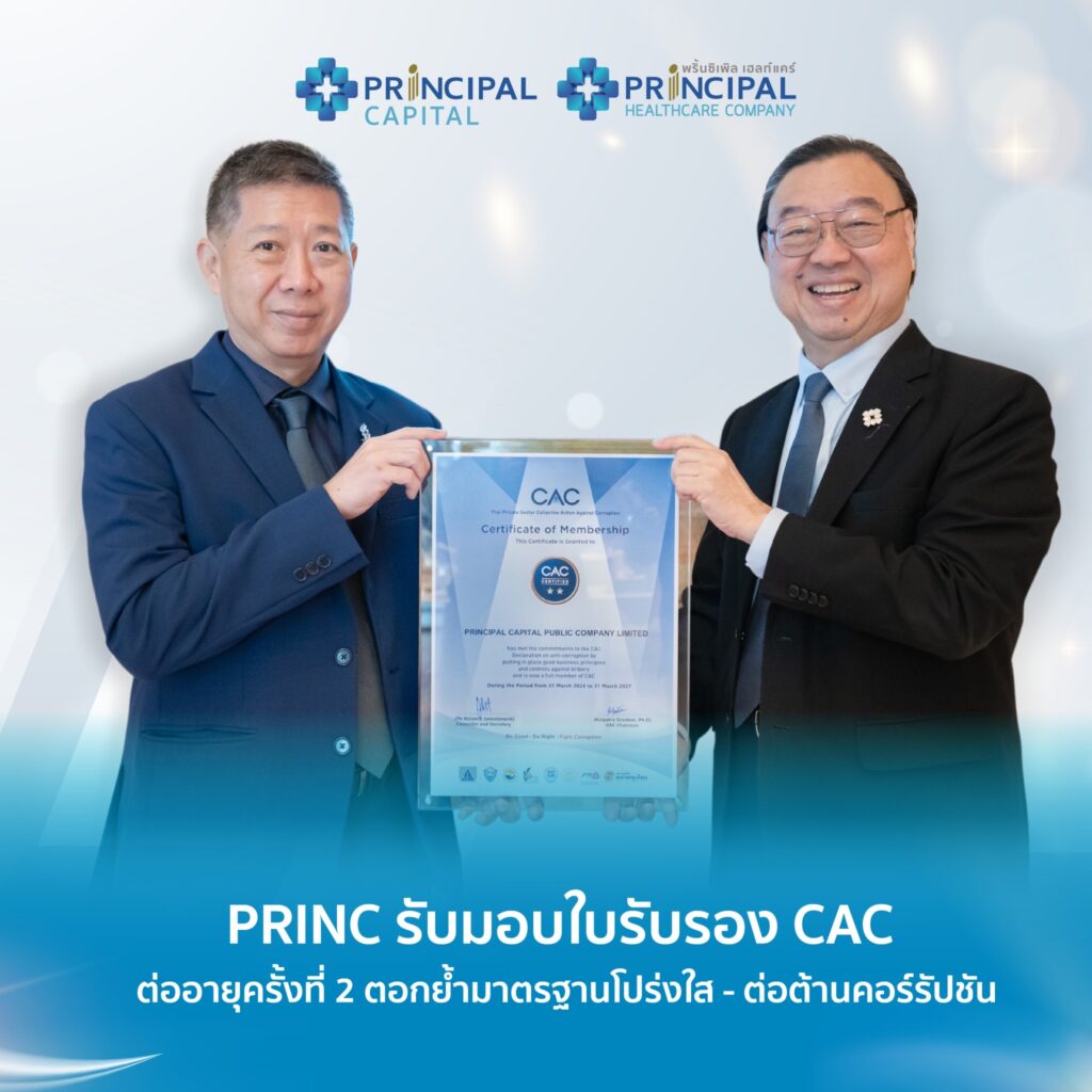 บริษัท พริ้นซิเพิล แคปิตอล จำกัด (มหาชน) ได้แสดงเจตนารมณ์อย่างชัดเจนในการดำเนินธุรกิจด้วยความโปร่งใสและมีธรรมาภิบาล โดยได้เข้าร่วมโครงการแนวร่วมปฏิบัติของภาคเอกชนไทยในการต่อต้านทุจริต (Thai CAC) และได้รับการรับรองการต่ออายุครั้งที่ 2 ในปี 2567 .