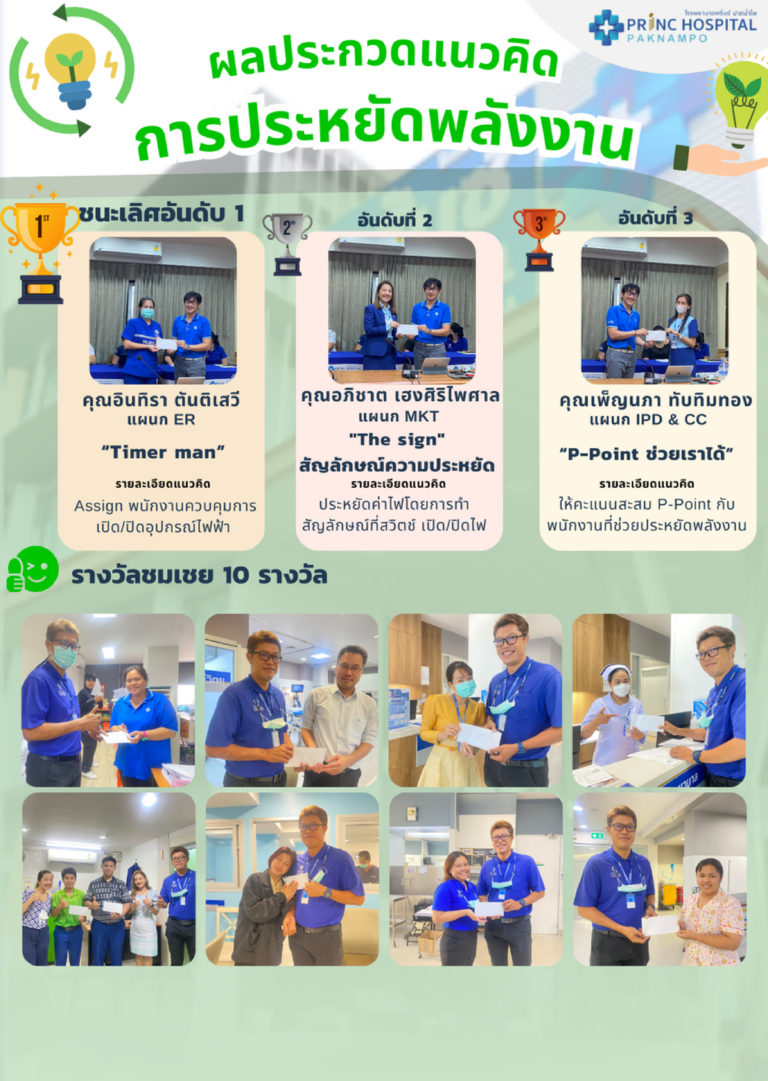 โรงพยาบาลพริ้นซ์ ปากน้ำโพ ในเครือพริ้นซิเพิล เฮลท์แคร์ และ บมจ.พริ้นซิเพิล แคปิตอล หรือ PRINC จัดกิจกรรมประกวดแนวคิดการประหยัดพลังงาน ให้พนักงานร่วมแชร์ไอเดียการประหยัดพลังงานในโรงพยาบาล มีพนักงานร่วมส่งไอเดียจำนวนมาก ตัวอย่างแนวคิดที่ได้รับรางวัล อาทิเช่น “Timer Man” กำหนดให้มีผู้รับผิดชอบในการเปิด/ปิดอุปกรณ์ไฟฟ้าตามเวลา, “The Sign” ทำสัญลักษณ์ที่สวิตช์เปิด/ปิดไฟ สร้างความตระหนัก, “P-Point ช่วยเราได้” สะสมแต้มคะแนน P-Point มอบให้กับพนักงานที่ช่วยประหยัดพลังงาน เป็นต้น